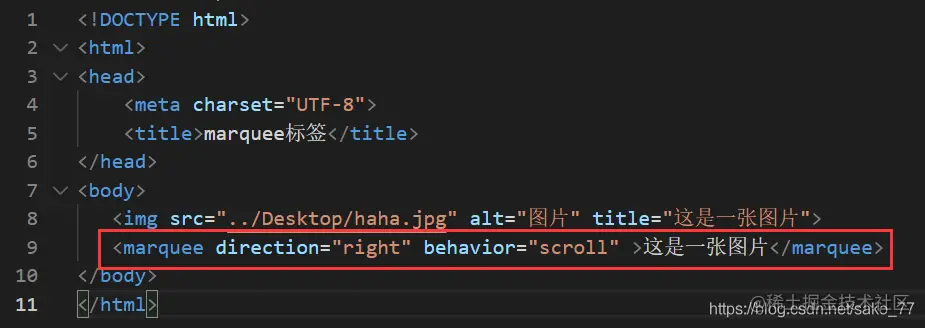 <marquee direction="滚动方向" behavior=“滚动方式” >滚动的文字</marquee>