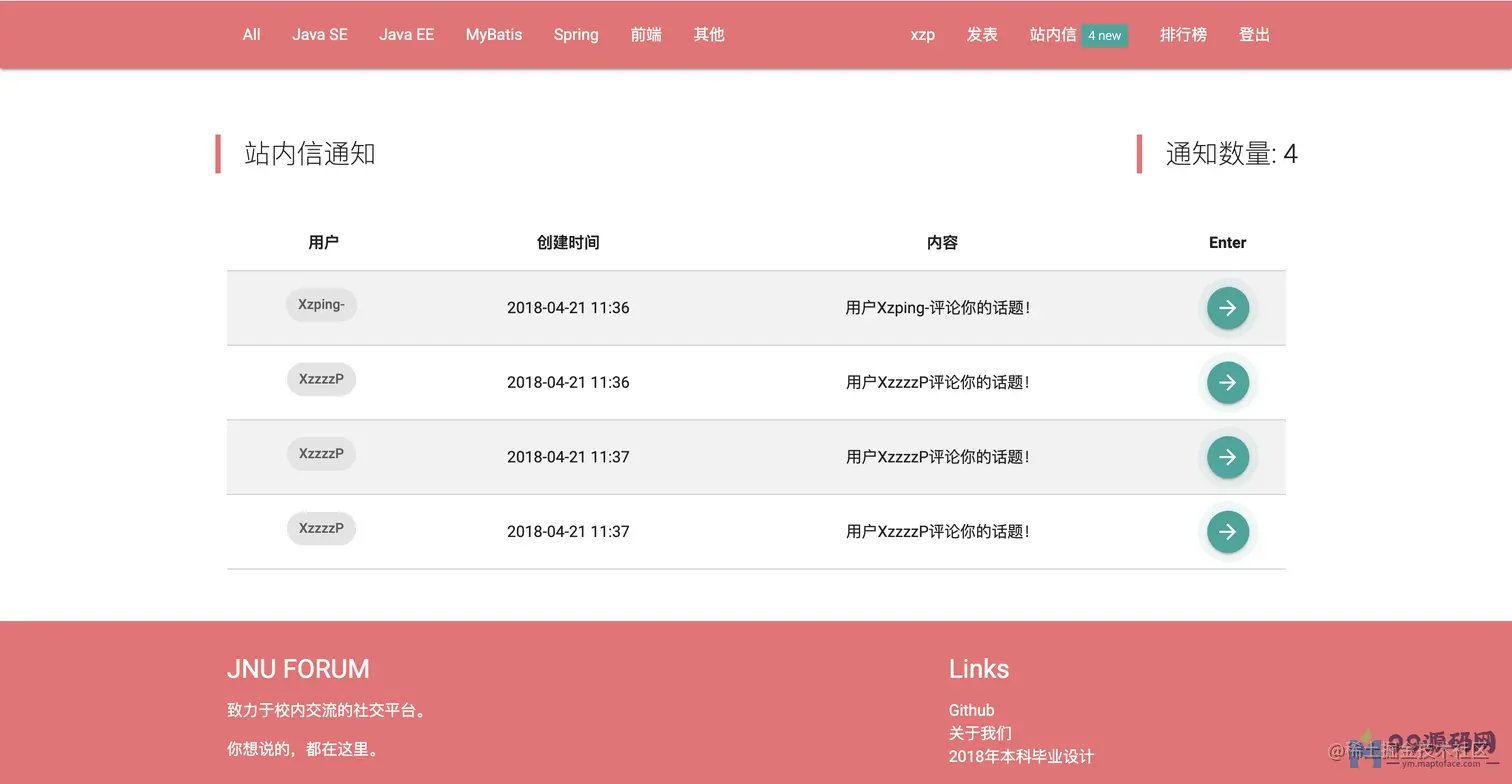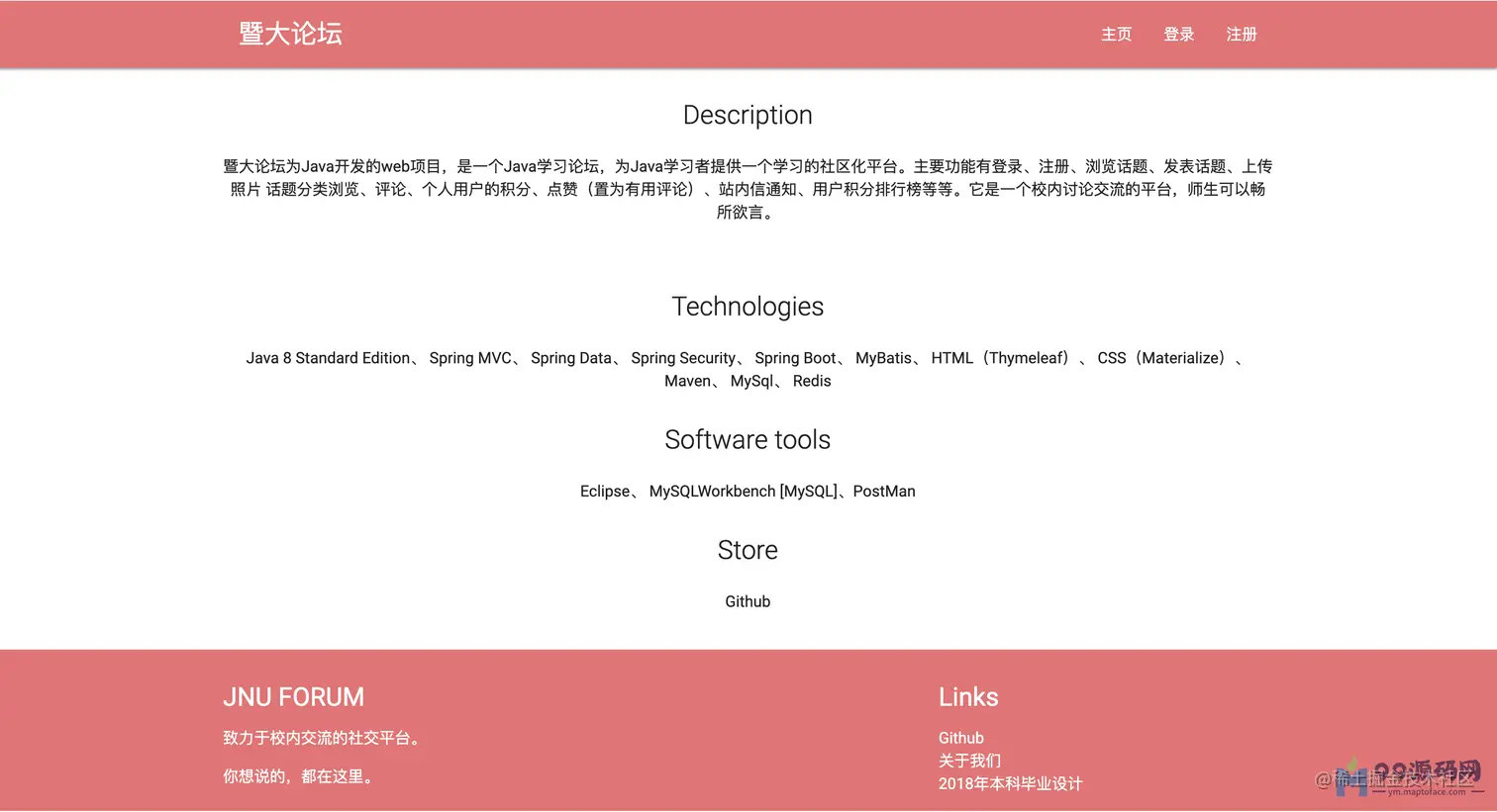 jnu_forum是基于Java的论坛系统。前端使用Html+CSS+JS实现,后端使用Java语言开发,技术栈包括但不限于Spring/SpringMVC/SpringBoot、MyBatis、Redis、PageHelper、MySQL、Maven等,开发工具为Eclipse。