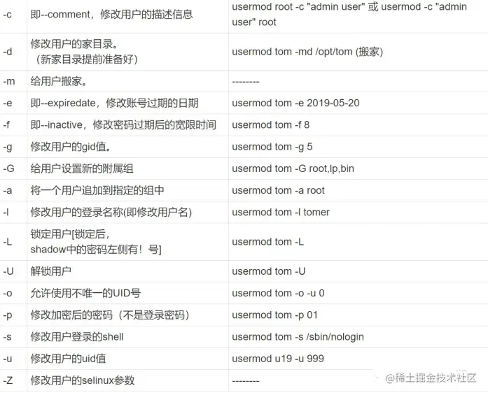 常用的选项包括-c, -d, -m, -g, -G, -s, -u以及-o等,这些选项的意义与useradd命令中的选项一样,可以为用户指定新的资源值。