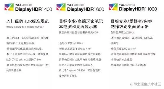 现在HDR显示器是有行业标准的,VESA(视频电子标准协会)的DisplayHDR标准有三个: