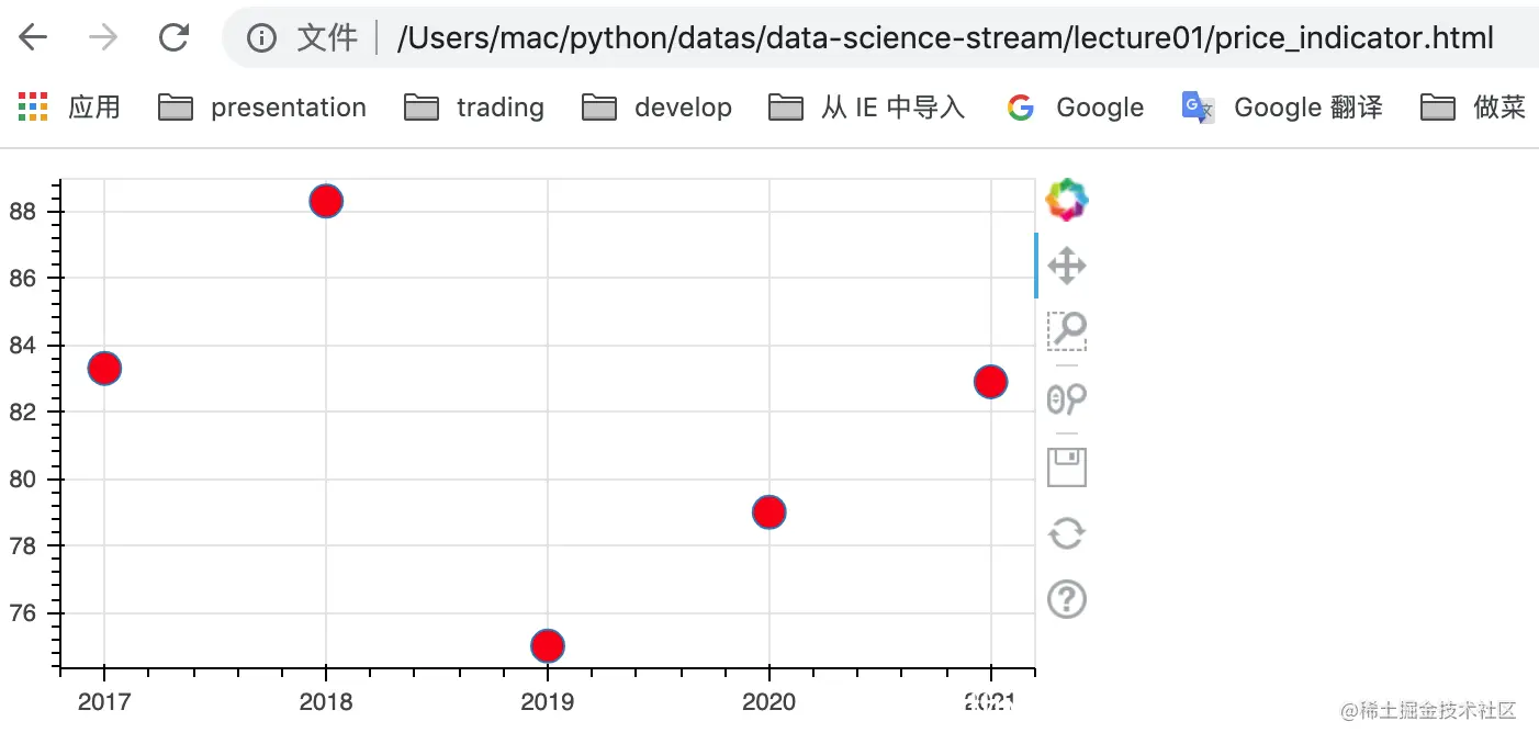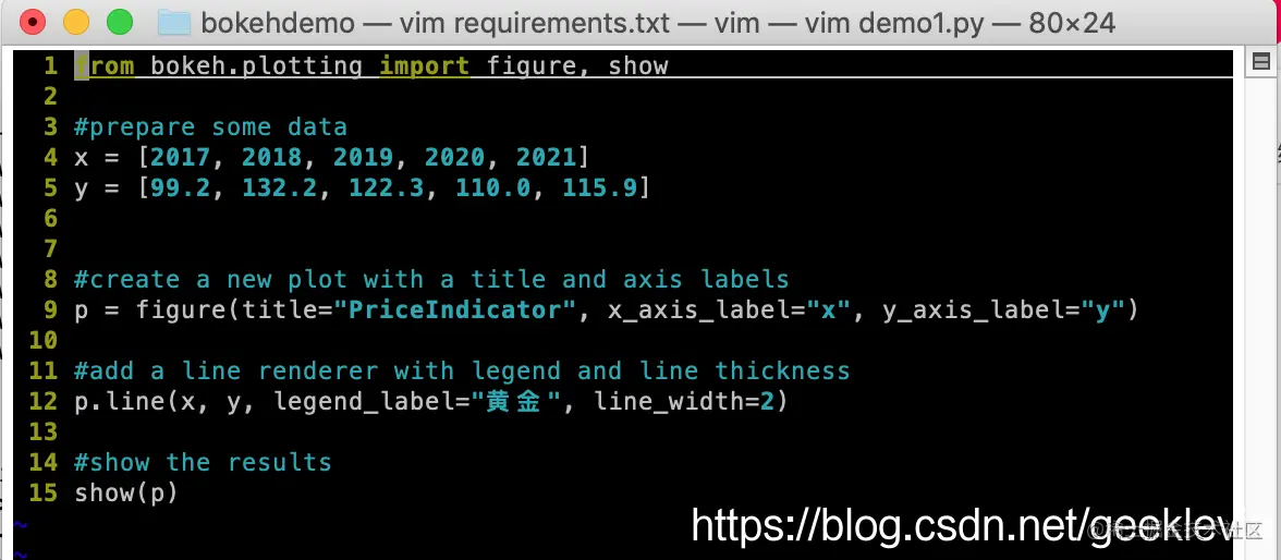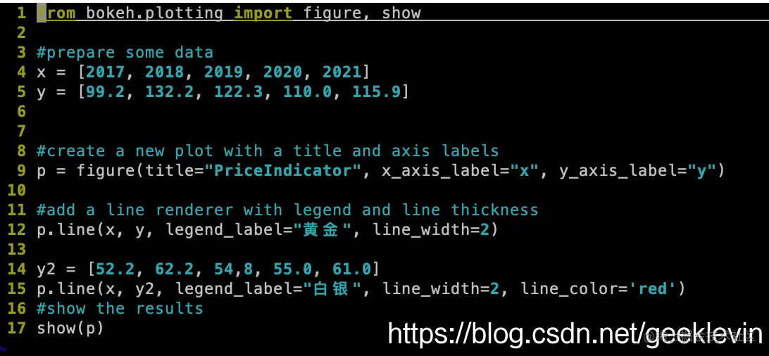 代码很直观:x数组为年份,y数组为一组虚构黄金价格。然后创建一个figure实例,p表示一张二维图。