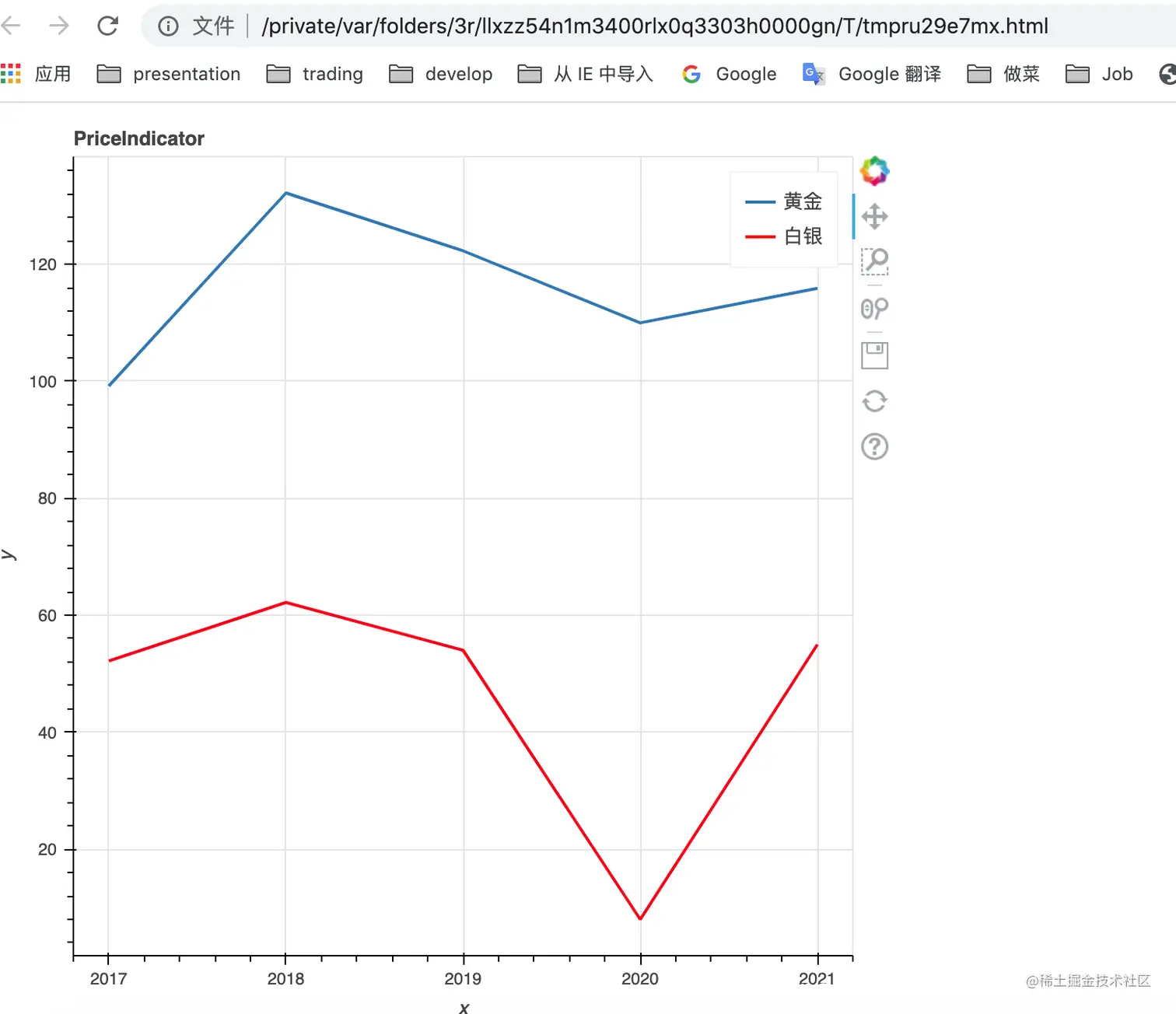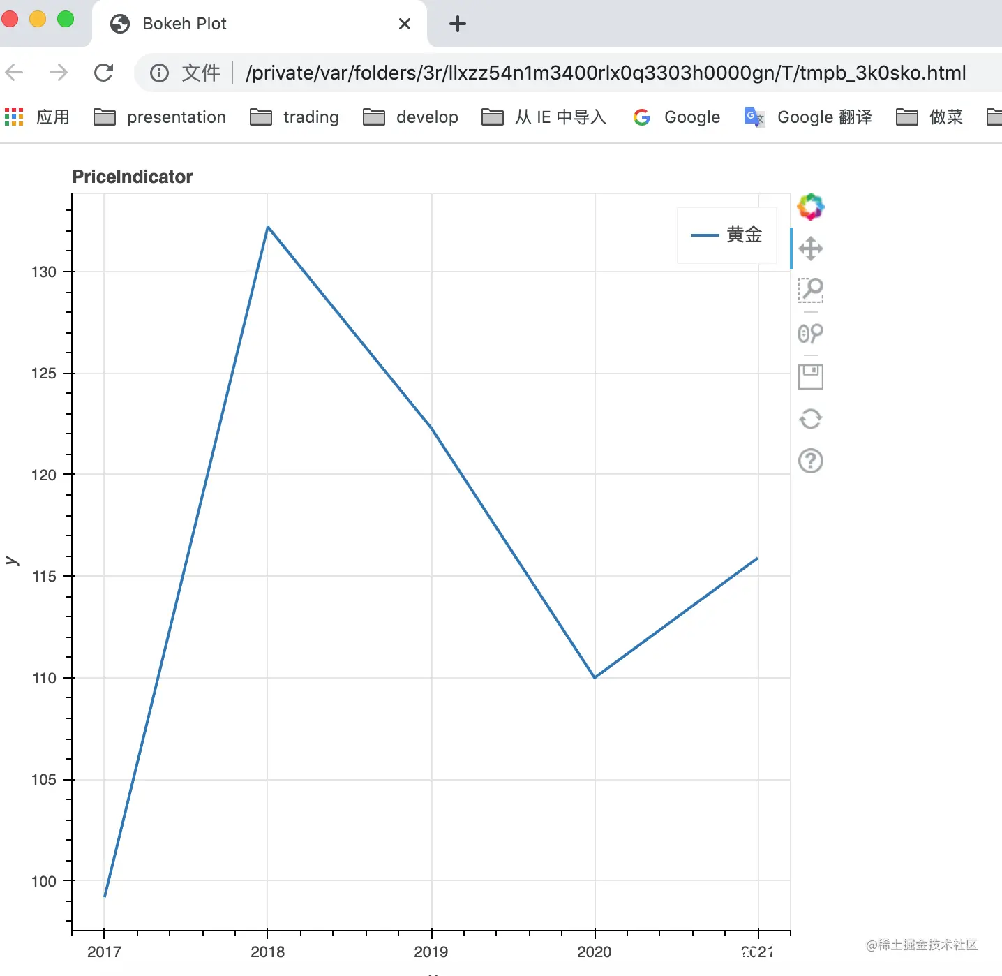 这里有两个维度,x(年份,2017至2021);y(黄金价格从99波动到115.9)。