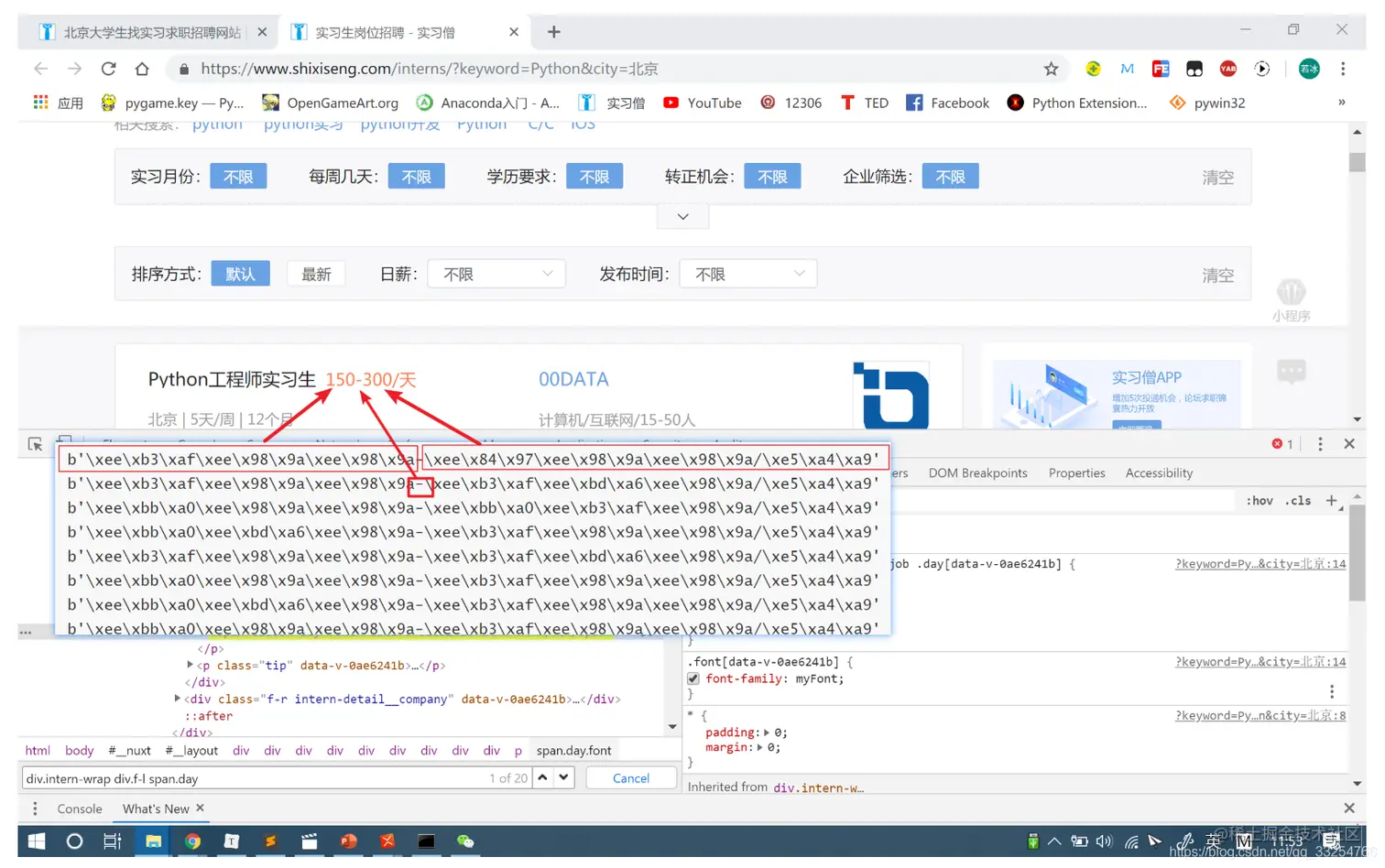 字体有3000多个,我们分析运行结果可知,实习僧网站就设置了一些常用字体的编码方式,这样我们计算机并没有这些字体编码方式;而相对比之下:我们发现对应的薪资是一个都没有显示出来,毕竟薪资也就才由几个基本数字组合而成的:0、1、2、3、4、5、6、7、8、9