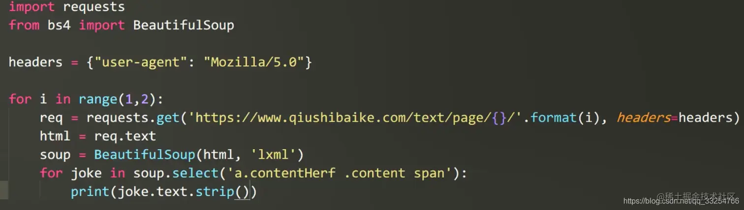 我们前面入手的第一篇是糗事百科,这里就不细讲了,部分代码提供如下: