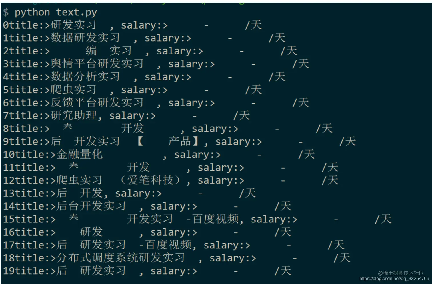 空白(不能说空白吧,有爬取到,只不过在上面的控制台里面我们可以理解为空白)部分就是实习僧的反爬虫机制;接下来就来破解它!