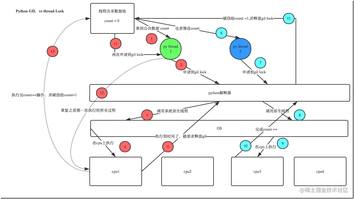 ① Create > ② GIL > ③ 申请原生线程(OS) > ④ CPU 执行(如果有其他线程,都会卡在 Python 解释器的外边)