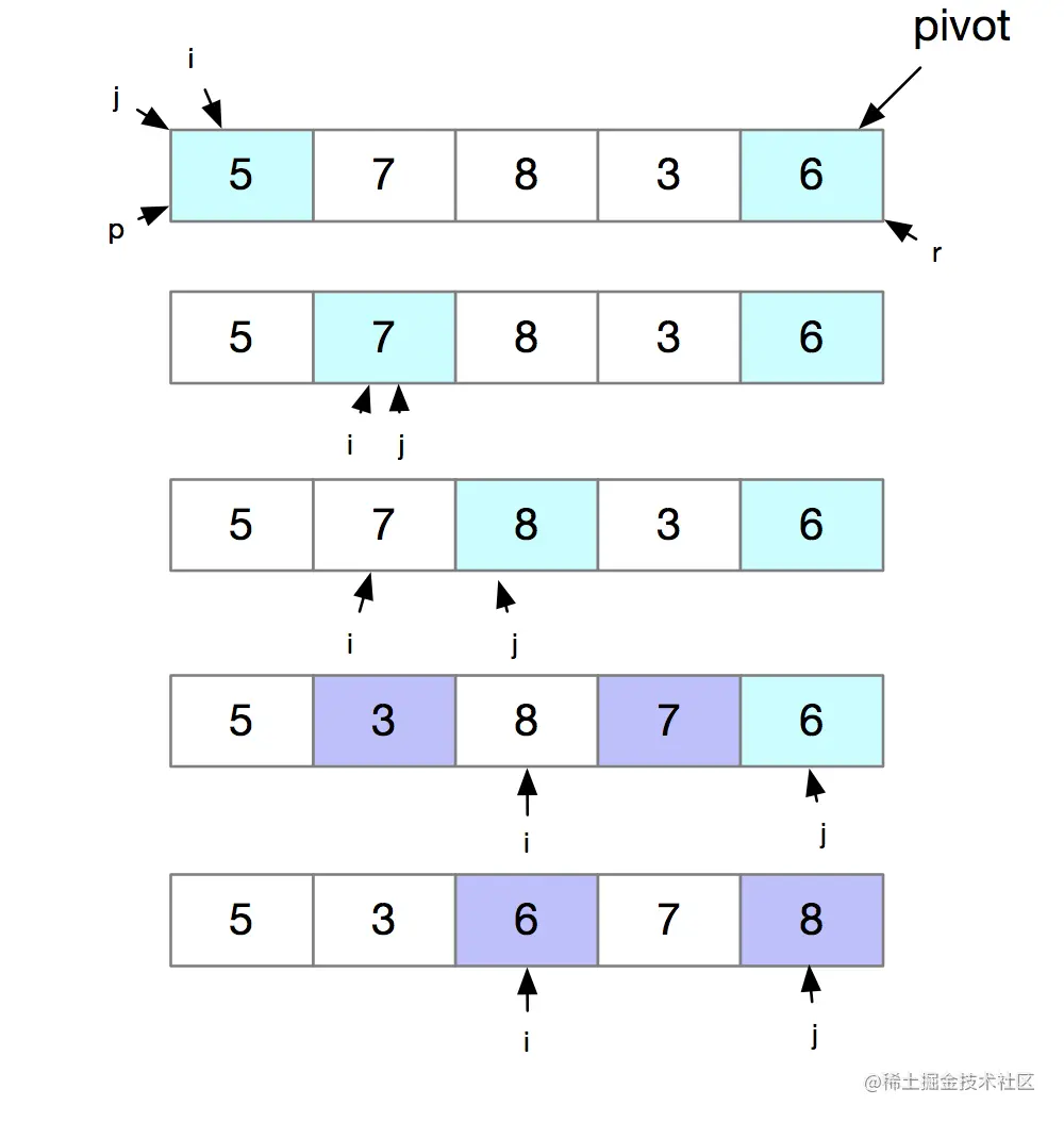 假如我们选择数组p到r的最后一个元素作为pivot,对数组5,7,8,3,6来进行快速排序。我们来看一下代码实现。