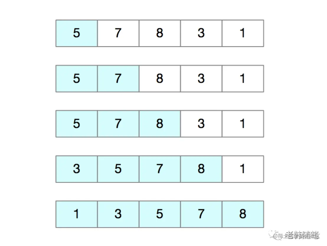 我们将数组中的数据分为两个区间,已排序区间和未排序区间。插入算法的核心思想就是取未排序区间中的元素,在已排序的的区间中找到合适的位置将其插入进去,并保证已排序区间数据一直是有序的。重复此过程,直到未排序区间为空。 如图,要排序的数据序列为5,7,8,3,1,其中左侧为已排序区间,右侧是未排序区间。