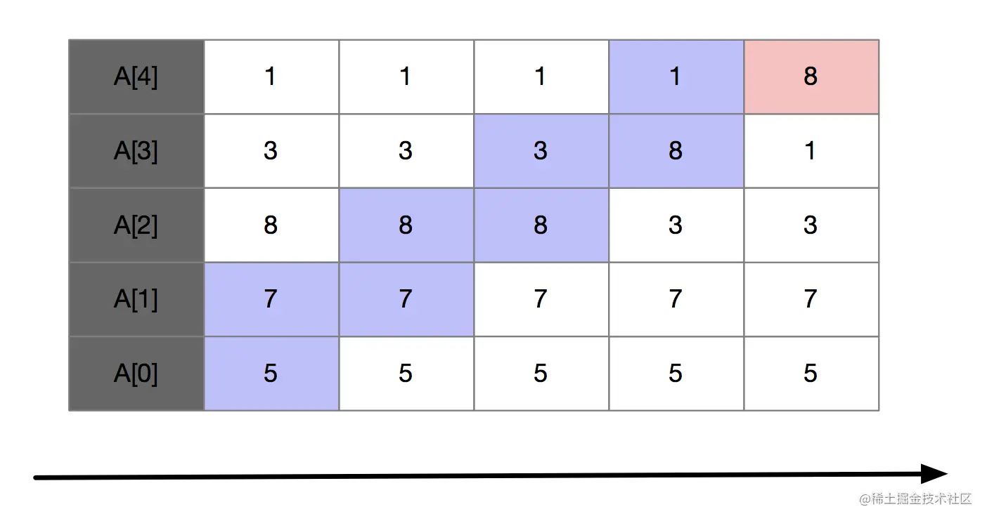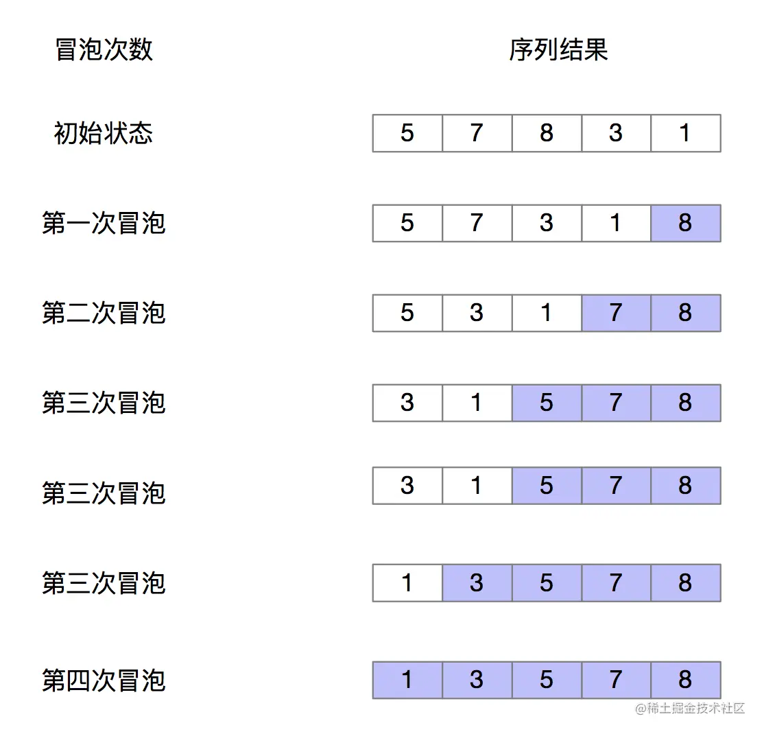 下面我们来看一个例子,假如我们要对5,7,8,3,1进行从小到大排序。第一次冒泡操作的过程如下:
