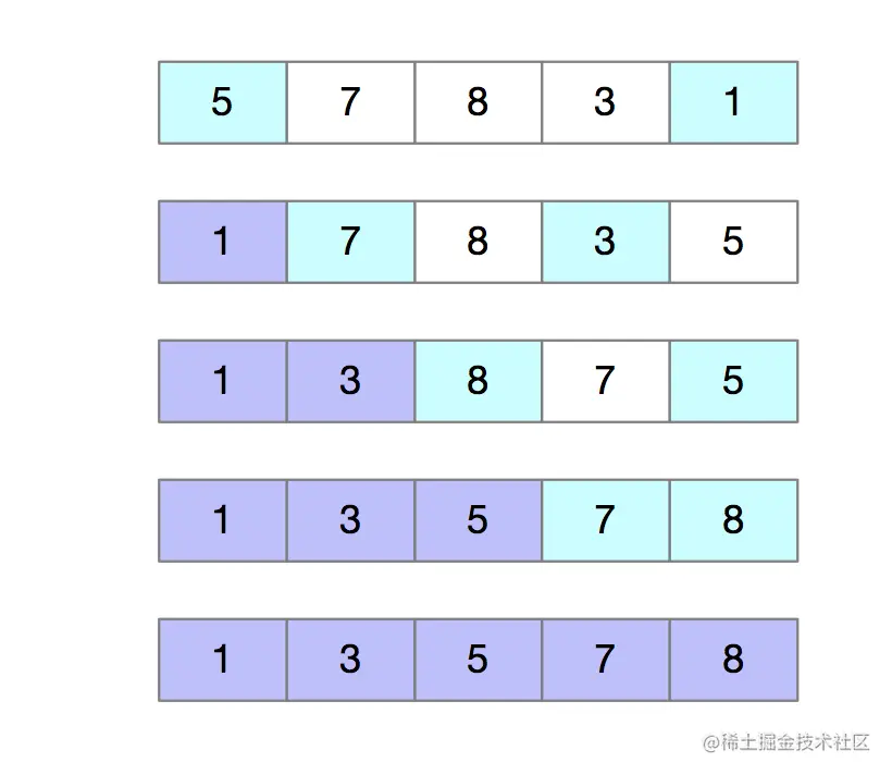 选择排序类似于插入排序,也分为已排序区和未排序区。但是选择排序每次都会从未排序区间找到最小的元素,将其放入已排序区间的末尾。如下图所示: