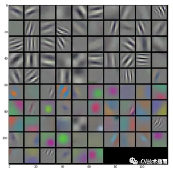因为第一层的输入是RGB图像,所有这些核也可以可视化为RGB,它们显示网络正在寻找的原始模式。这些96个内核中的每一个在输入上以网格模式应用,结果是一系列96个二维数组,它们被视为具有96个通道深度的输出图像。如果您习惯了像Sobel操作符这样的图像处理操作,您可以想象它们都有点像针对图像中不同重要模式优化的边缘检测器,因此每个通道都是输入中这些模式发生位置的映射。