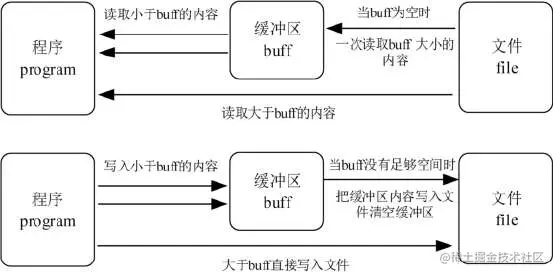 缓冲区的设计是为了存储多次的写入,最后一口气把缓冲区内容写入文件。当发起一次读写操作时,计算机会首先尝试从缓冲区获取数据;内容当缓冲区内没有数据时才会从数据源获取数据更新缓冲区。