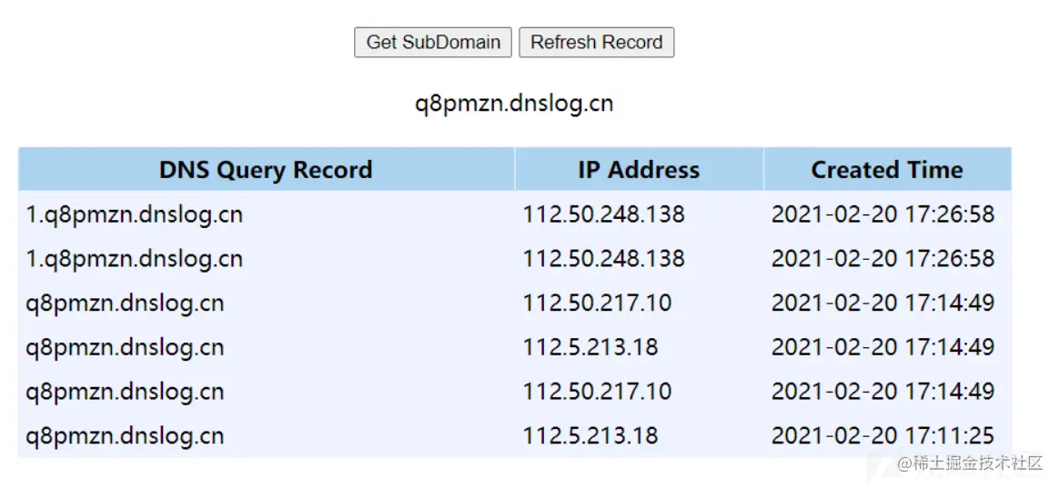 这里一直刷新访问网址,并在DNSlog.cn里刷新记录(Refresh Record),可是无论怎么刷新,记录都是只有这几条。因为dns协议的目的是我要访问这个域名,可是不知道对应的ip,我就去问,第一次不知道,第二次不知道,第三次也不知道,那第四次总该记住了,这就是dns缓存了的问题。碰到一个新来的域名我不知道,但是问了几次之后我就知道了,我就不需要再查询了。这就是为什么怎么刷新都不会有新的记录了。