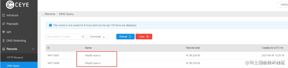 (1)login进入后,会给我们一个三级域名,在用户详情页"Profile"中自己的域名标识符"Identifier"。对于每个用户,都有唯一的域名标识符如 xxx.ceye.io 。所有来自于 xxx.ceye.io 或 *.xxx.ceye.io 的DNS查询和HTTP请求都会被记录。