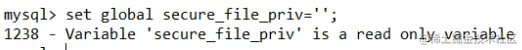 secure_file_priv不能通过此方法修改,因为报错为Variable 'XXX' is a read only variable。报错原因及修改方法为:参数为只读参数,需要在mysql.ini配置文件中更改该参数,之后重启数据库