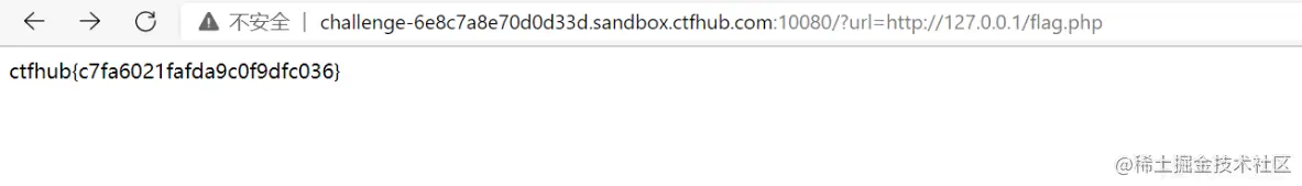 这里因为是让我们从目标主机内网环境访问其本地的flag.php,那我们就构造:/?url=http://127.0.0.1/flag.php