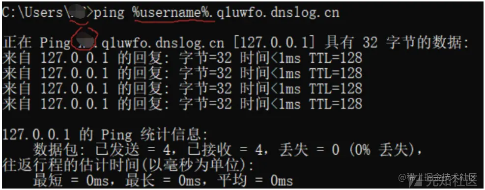 可以看到解析的日志会把%USERNAME%的值给带出来,因为系统在ping命令之前会将%USERNAME%的值解析出来,然后再和a.com拼接起来,最后ping命令执行将XF.a.com一起发给DNS服务器请求解析域名对应的ip地址,这个过程被记录下来就是DNSlog,看到这里应该有点感觉了。原理上只要能进行DNS请求的函数都可能存在DNSlog注入。