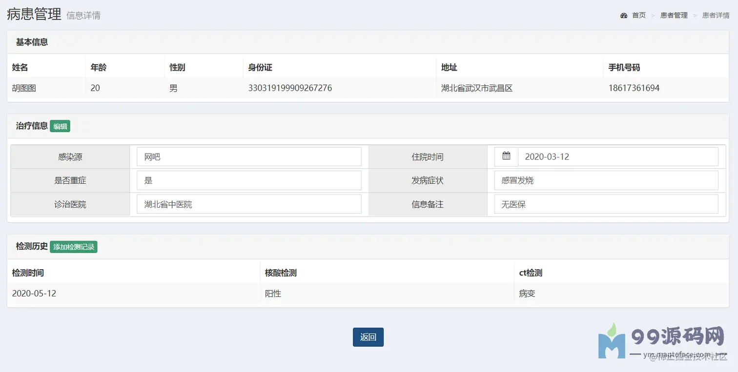 患者详情界面详细的展示了患者的基本信息如下:姓名、年龄、性别、身份证等,治疗信息如下:感染源、是否重症、住院时间、发病症状、诊治医院、信息备注,以及相应的核酸检测及ct检测历史,如下图所示。