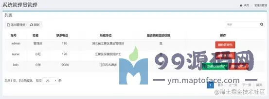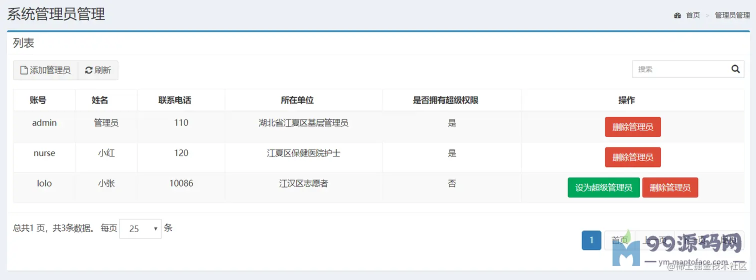 系统管理员界面可查看管理员信息、添加管理员、对管理员进行删除、将普通管理员设置为系统管理员操作,如下图所示。