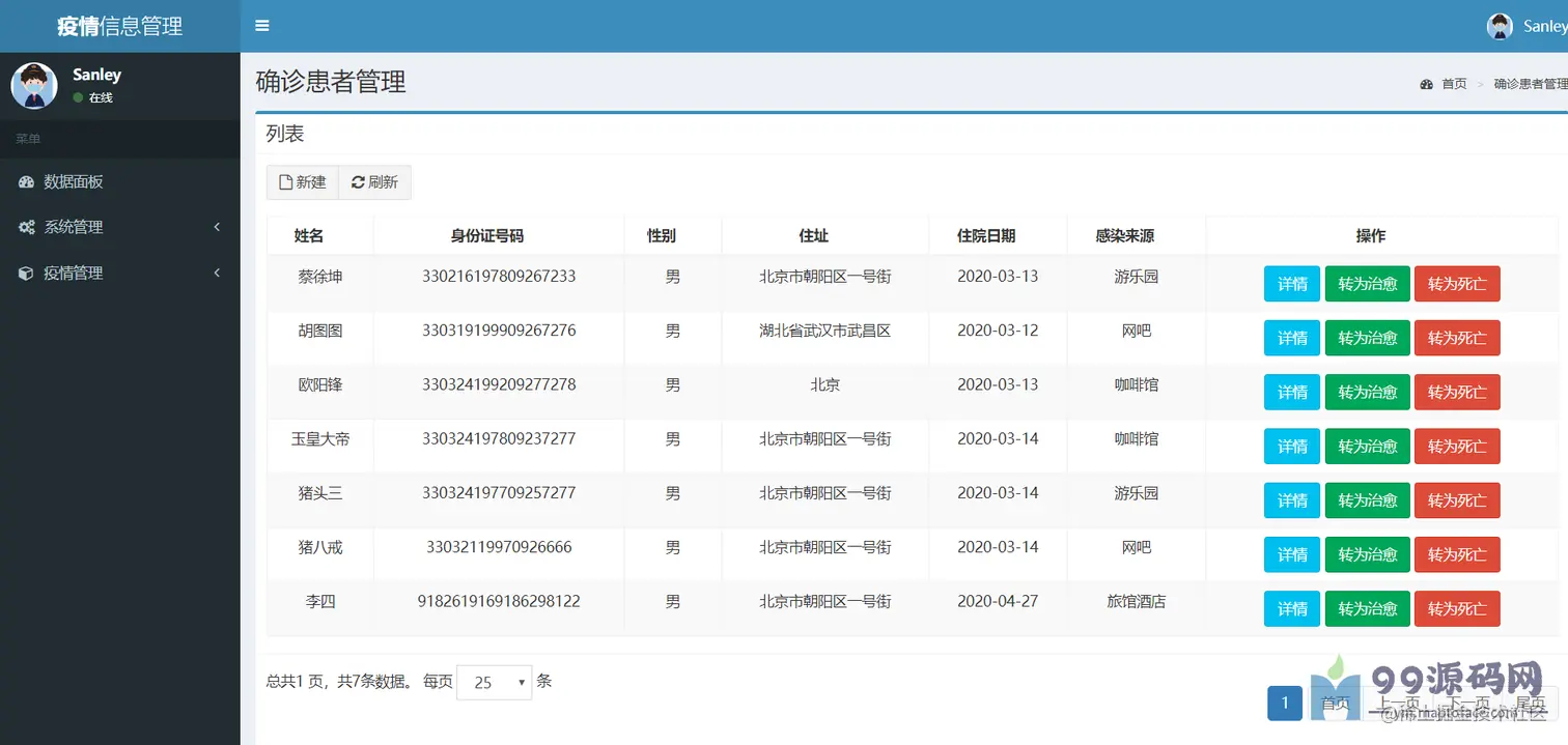 确诊患者管理界面将当前确诊患者列出显示其基本信息,左下角显示共有多少确诊患者,并可选择每页显示多少条数据,数据右侧则是对相应确诊患者进行管理操作,可以查看详情,查看确诊患者详情信息、将当前确诊患者转为治愈、将当前确诊患者转为死亡,如下图所示。