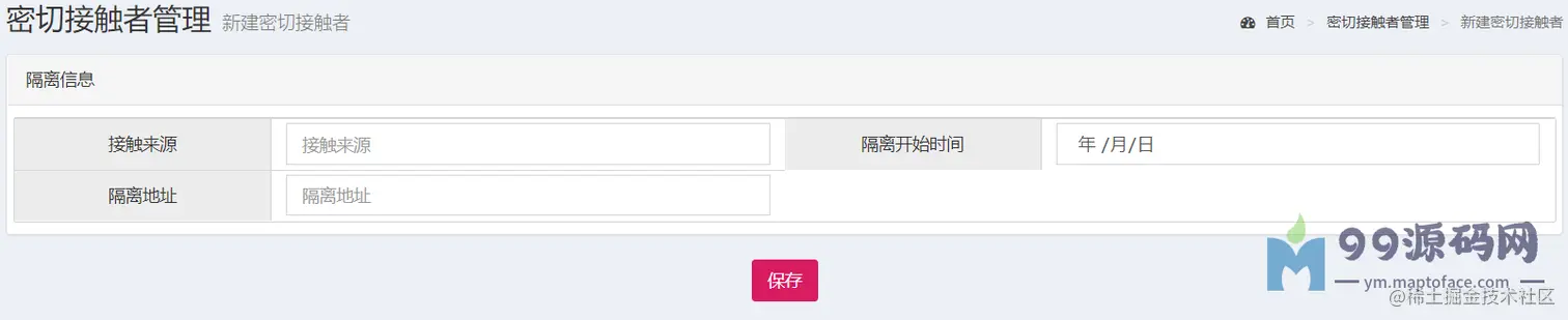 新建密切接触者界面包含两部分,一是添加密切接触者的基本信息如下图所示,点击下一步则跳转到添加隔离信息界面如下图所示