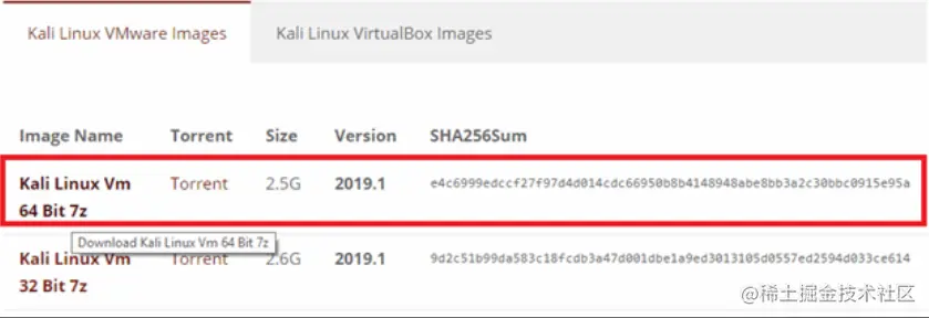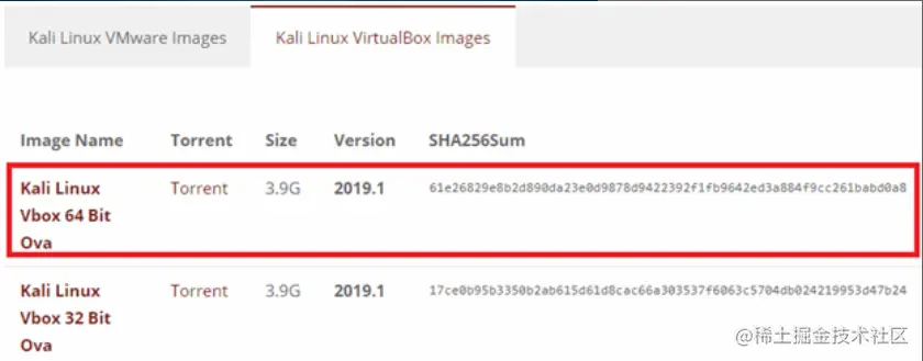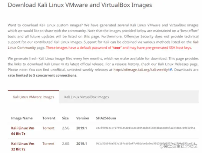 安装了虚拟化主机软件后,让我们开始下载一些虚拟机。我们将安装的第一个虚拟机是Kali Linux。 Kali Linux是目前使用最流行的攻击版本之一,由Offensive Security创建。它们提供.iso文件,允许你通过将磁盘映像刻录到CD或可引导的u盘进行全新安装。然而,我们将在虚拟主机软件中使用一个更简单的选项。如果你转到这个页面并向下滚动,你将发现一个名为“下载Kali Linux 虚拟机和VirtualBox Images”的部分。