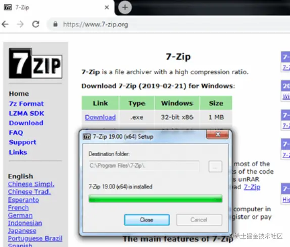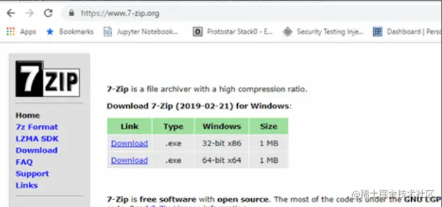 下载完成后,你会注意到该文件是压缩的.7z格式。要解压缩此文件,你需要安装7-zip。你可以在7-zip.org下载安装文件。就像虚拟机文件一样,你需要根据你使用的体系结构选择文件。和以前一样,我们将选择64位文件