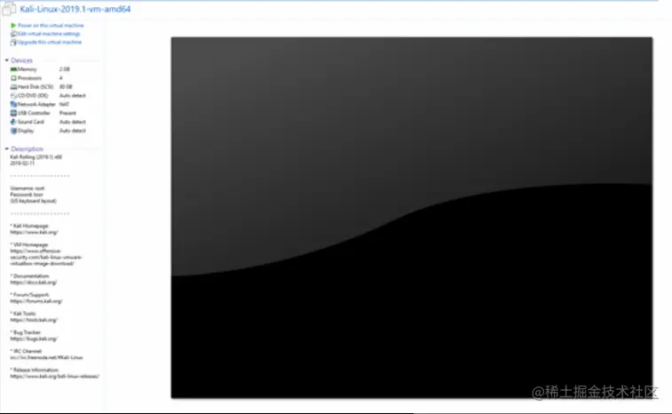 按照以下步骤操作,当登录屏幕出现时,使用与VMWare映像相同的凭据。用户名是“root”,密码是“toor”。