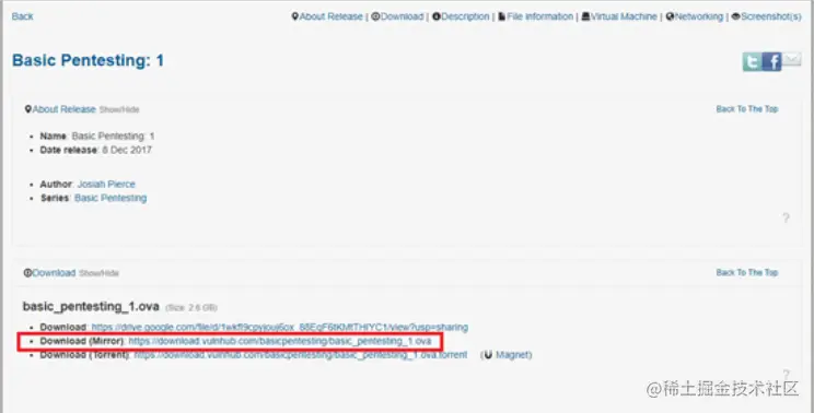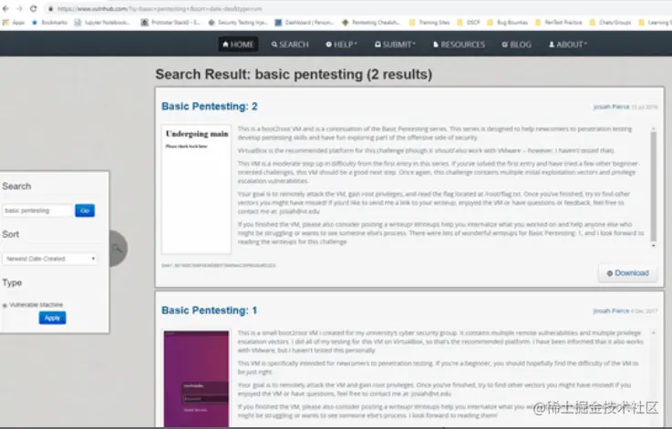 我们将研究的第一个易受攻击的计算机是来自Vulnhub的 Basic Pentesting: 1,Vulnhub是一个提供各种漏洞环境的靶场平台,供安全爱好者学习渗透使用,大部分环境是做好的虚拟机镜像文件,镜像预先设计了多种漏洞,需要使用VMware或者VirtualBox运行。每个镜像会有破解的目标,大多是Boot2root,从启动虚机到获取操作系统的root权限和查看flag。进入Vulnhub页面,在搜索框中输入“basic pentesting”并点击“Go”。 Basic Pentesting有两部分,但我们要从第一部分开始。