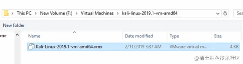 然后导航到Kali Linux文件夹所在的位置并点击它,此时你将找到.vmx文件。点击它并选择“打开”,虚拟机将使用该文件中的设置来创建虚拟机。