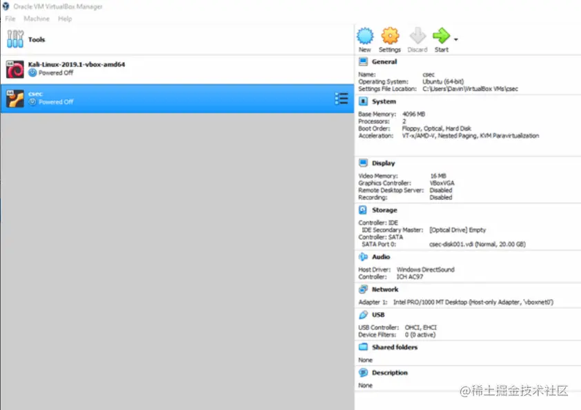 现在,如果查看VirtualBox Manager页面,你将看到安装了两个虚拟机。启动Basic Pentesting 1,可以看到它被标记为“csec”。