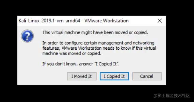 首次启动虚拟机时,你会看到弹出一个框,选择“我复制它”。