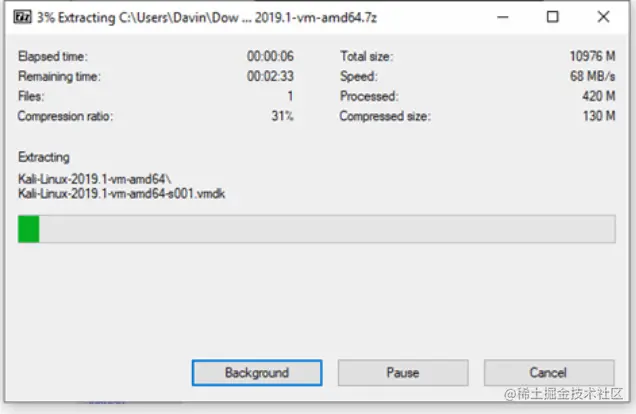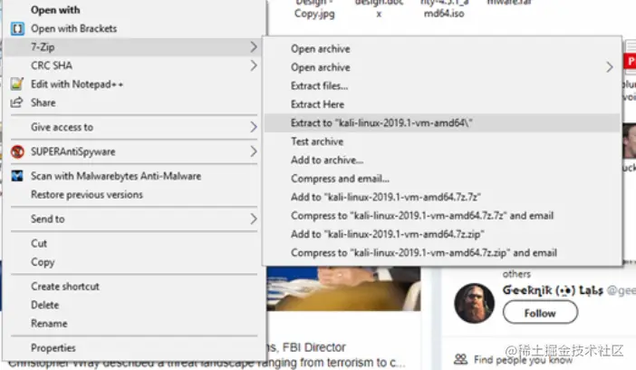 安装了7-zip后,我们可以右键点击Kali Linux文件并在7-zip下拉列表中解压缩它。