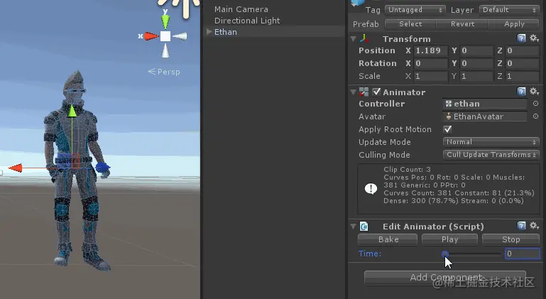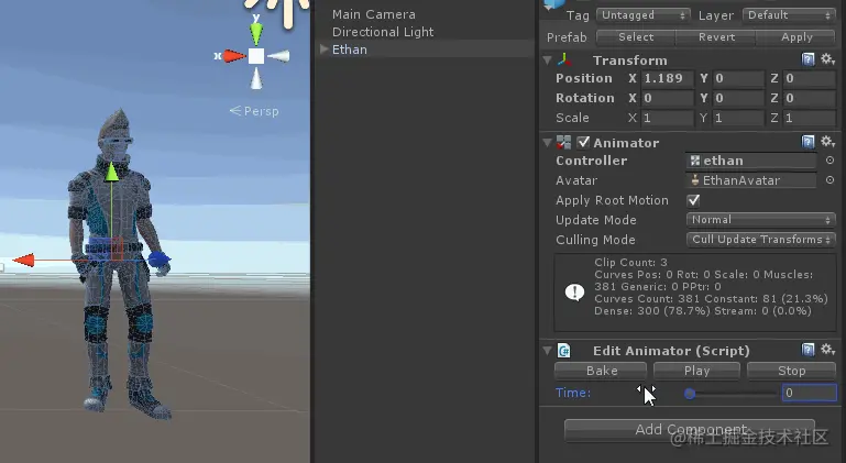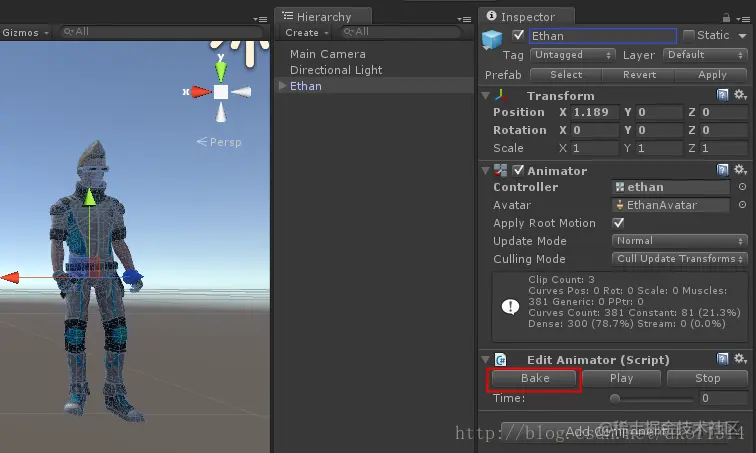 点击"Bake",可以看到此时人物姿势变成了动画状态的第一帧,如下所示: