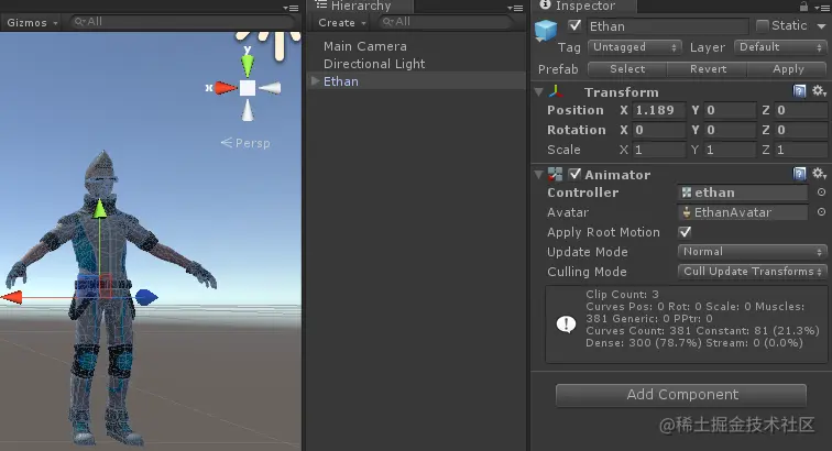创建一个带Controller的Animator对象,可以看到此时人物呈现T型姿势。附上新脚本EditAnimator,此为空脚本,如下: