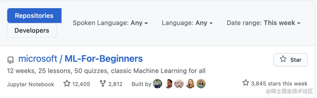 该课程在 GitHub 挺受欢迎,排在周榜第一。