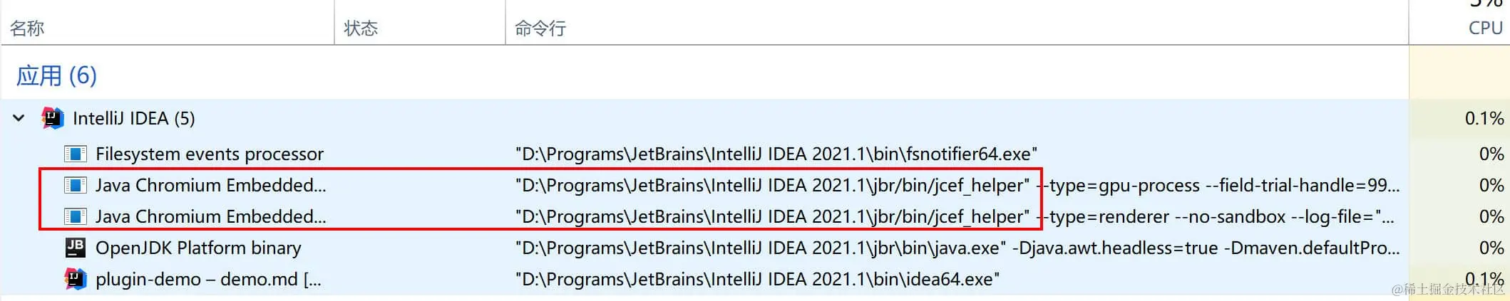 因为之前,本人使用过JCEF进行开发。看到这个渲染,心里大概猜测,应该用了浏览器内核。打开任务管理器: