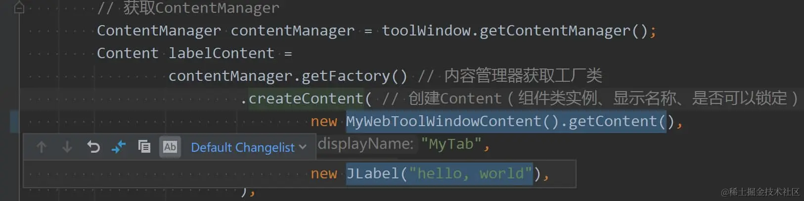 可以看到,此时的ToolWindow中的内容显示为我们上面设置的new JLabel("hello, world"),该ToolWindow上方有我们设置的"My Tab"标题。截至目前的代码,包含在这个github上这个提交: