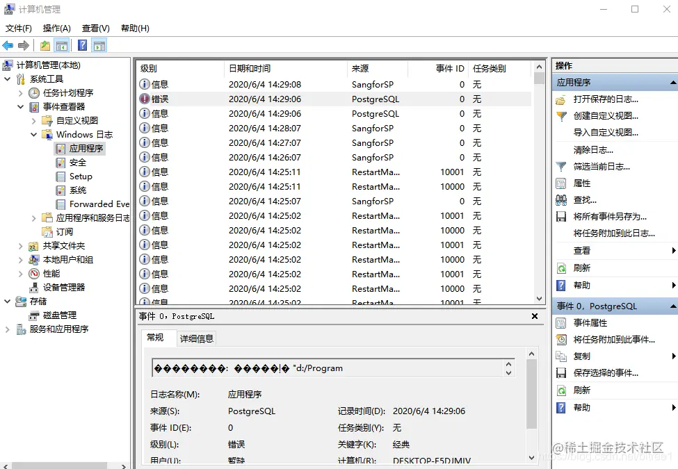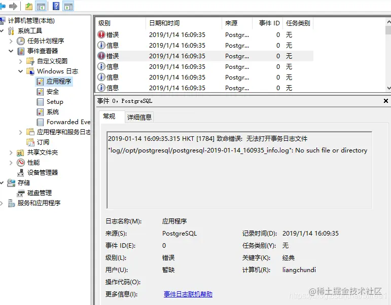 查看系统日志:打开计算机管理====>查看应用程序日志信息,可以看出,由于日志配置错误的问题