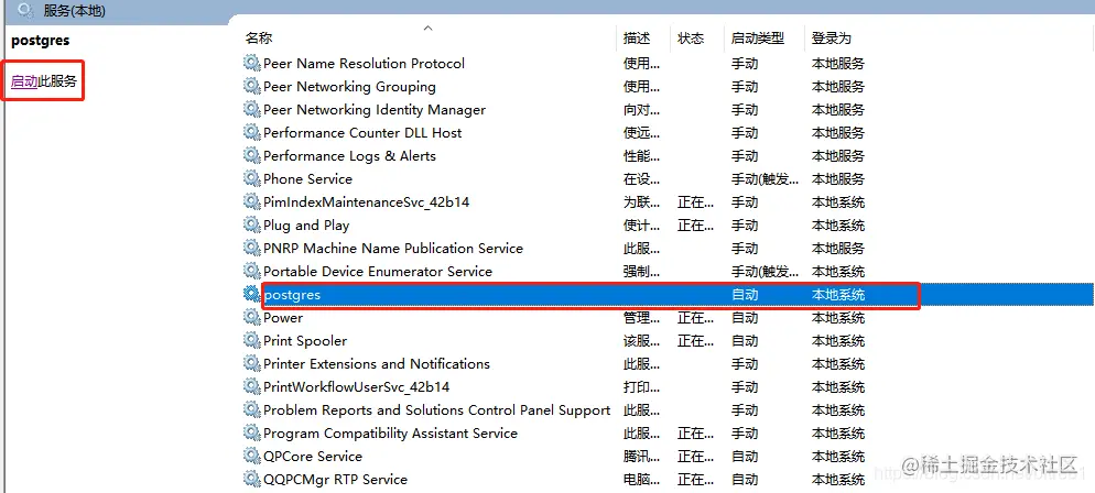 7.启动服务,cmd 输入 net start postgres 或者打开服务目录点击启动如下