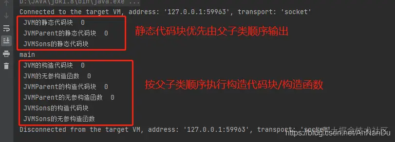 根据上面的代码可以看到,我们的main方法、构造代码块、静态代码块都是没有顺序的放置,但是在输出结果里可以看到他们的执行是有固定顺序的, 看下图 :