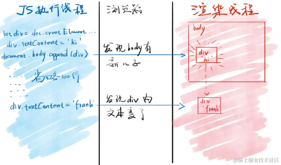 浏览器会发现JS的意图,并通知渲染线程在页面中渲染div1对应的元素 - 在div1放入页面之后