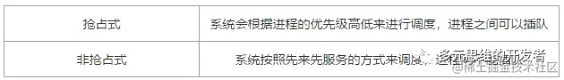 抢占式 系统会根据进程的优先级高低来进行调度,进程之间可以插队 非抢占式 系统按照先来先服务的方式来调度,进程间不能插队