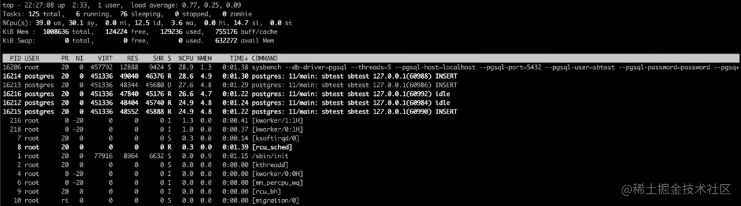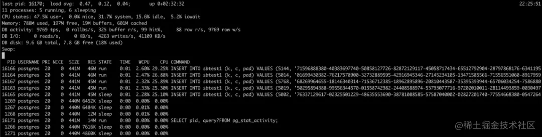 如果已经知道PostgreSQL进程的内存利用率很高,但日志没有看出什么问题,还可以使用另一个工具 pg_top 。