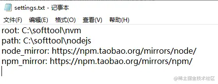 设置 node 和 npm 镜像地址 在nvm安装目录,找到 setting.txt加上如下两行: