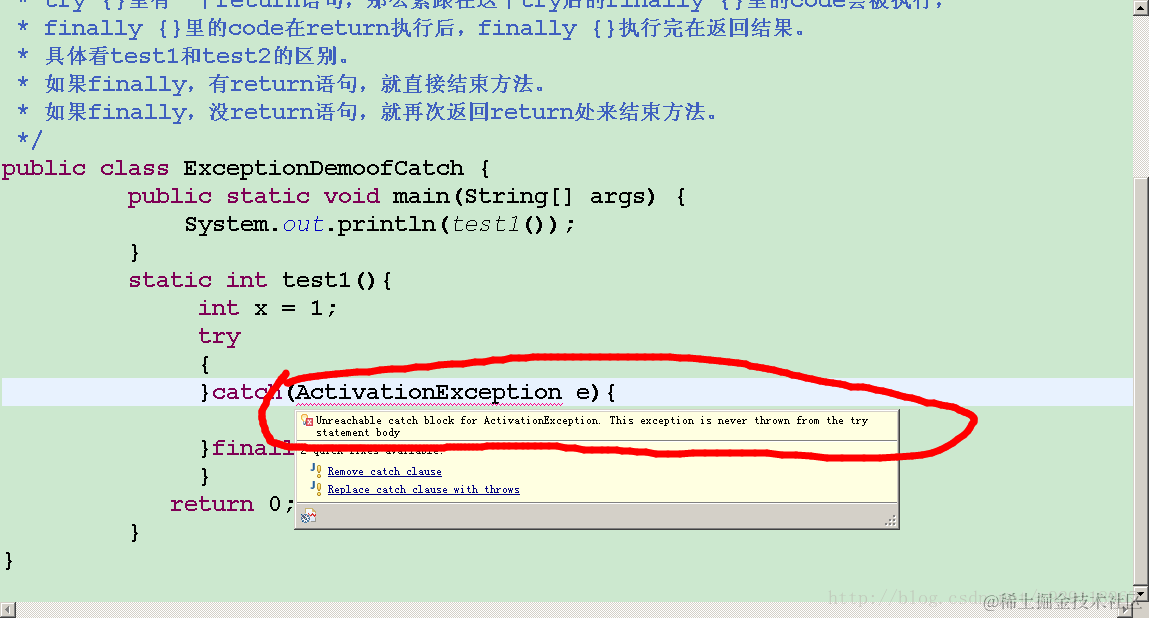 .编译时异常,如果没有产生异常,就不能去捕捉。在IDE中,如果产生捕捉时将提示如此信息: