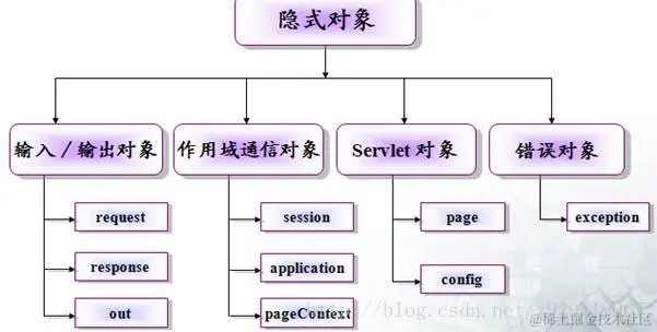 对象不需要创建,可以直接调用。 out 、 request 、response;