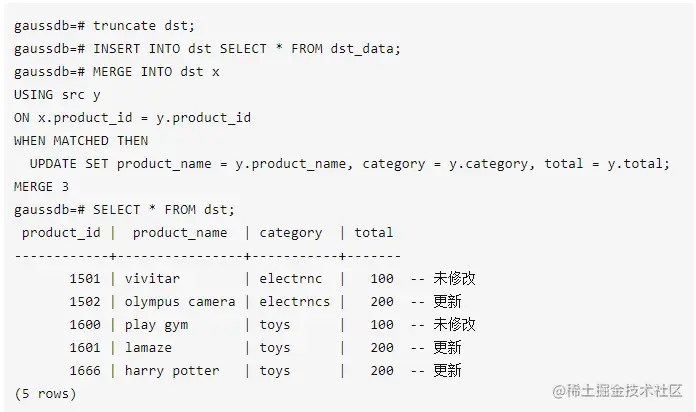 下面例子在两表可关联时,只会更新product_name = 'olympus’的行。在两表无法关联时且源表的product_id != 1700时才会进行插入。
