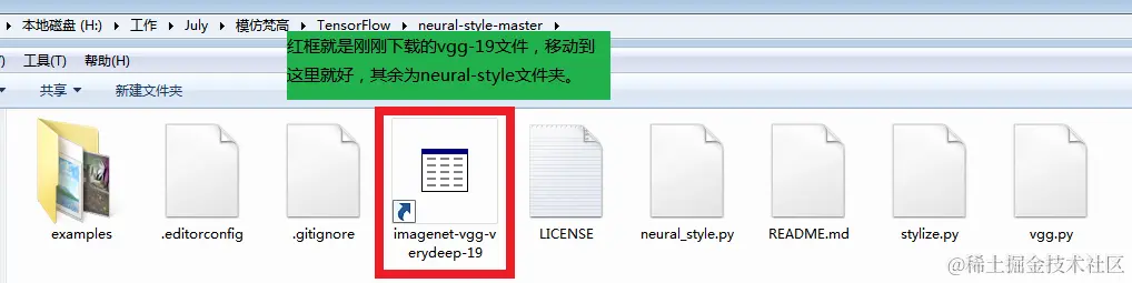 下载后的文件放到刚刚的neural-style文件夹根目录下就行,如图就是我下载复制好的文件样子。