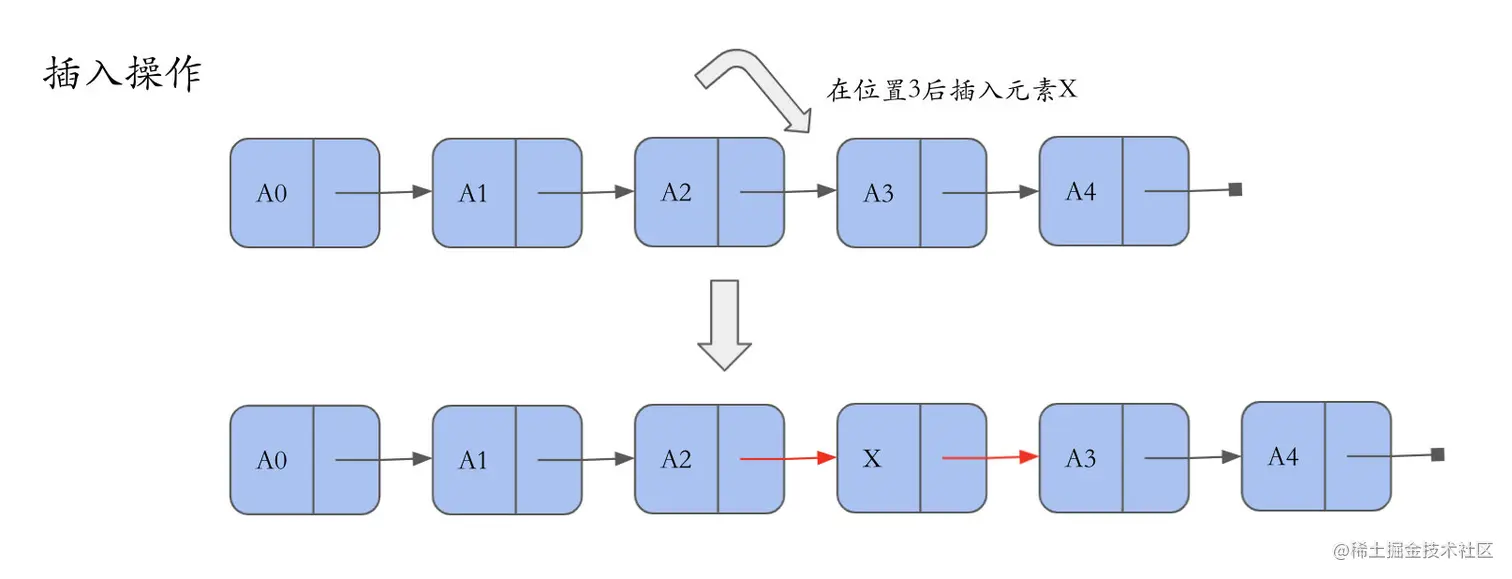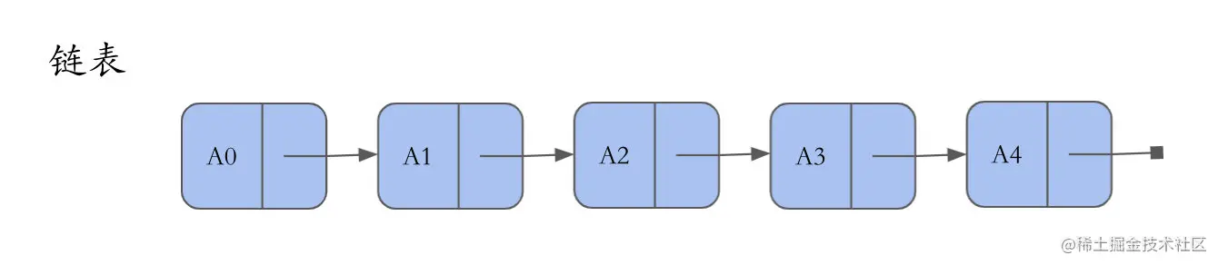 区别于数组,链表中的元素可以不连续存储,每一个元素包含该 元素的数据 和 指向链表下一个节点的指针。